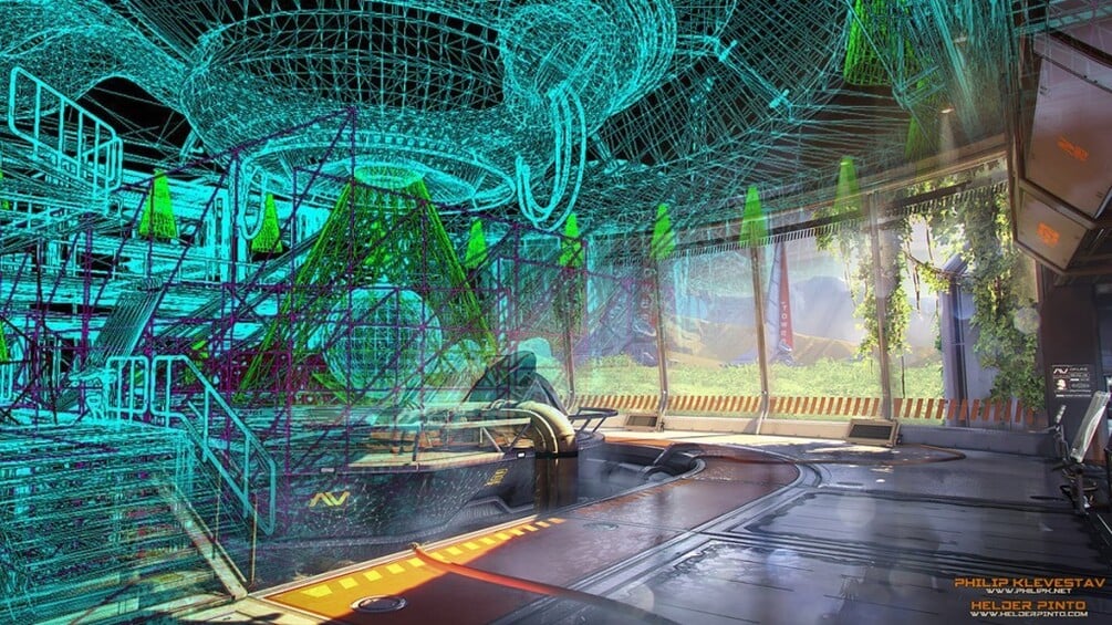 Humans have colonized this planetoid called Askalaphos and are in the process of creating an atmosphere similar to planet earth by using a fusion powered atmosphere processing station. The air outside is not 100% breathable yet, but it already allows for the growth of vegetation. Hence the use of H2O as the main element of the scene, the whole point of this facility is to create a breathable and living atmosphere which couldn’t not be possible without… Water! No water, no life anywhere! The scene is set inside one of the outer rooms of the station, more specifically inside one of the big control rooms, featuring a gigantic window with a beautiful view to the outside world, which from that angle you’ll be able to see the other end of the complex, the other towers, natural terrain and the sky. We wanted to make use of bold colors and staying away from the same old desaturated look you typically see in sci-fi, we were also set on staying away from gritty/scary as much as possible and instead try and make the space seem like it’s livable and looking almost inviting. This whole facility is built around the idea of creating life, anyway!